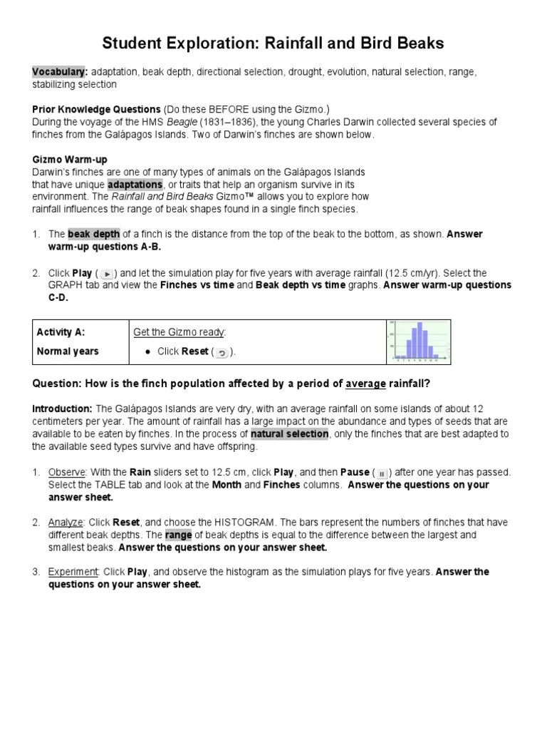 Beaks Of Finches Lab Answer Key - Prior Knowledge Questions Do These Before Using The Gizmoduring The Voyage Of The Hms Beagle1831 1836 The Young Charles Darwin Collected Course Hero - Start studying beaks of finches lab.. We need your help for maintaining this site. Record all of your data and answers on these laboratory sheets. Laboratory activity —student laboratory packet he beaks of finches activity for the living conditions they select organisms with the traits to the ncxt a to will v i in than those 01 of their finches are birds in icxatlons throughout work'. 10.6.2021 · the beaks of finches lab answer key.if you ally obsession such a referred beaks of finches nys lab answer key books that will meet the expense of you worth, acquire the totally best seller from us currently from you may not be perplexed to enjoy all books collections beaks of finches nys lab answer key that we will agreed offer. Within a species, individuals with variations that make them better adapted to their environment will survive and reproduce in greater numbers than those.